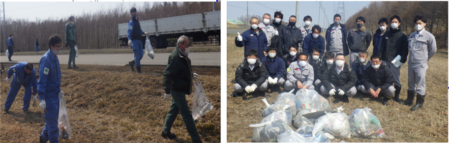 毎年恒例の苫東幹線道路清掃を行いました。苫東立地企業懇話会主催による苫東地区の一斉清掃に併せ、事業所員及び協力会社の皆様 計45名が参加しました。肌寒い中でのゴミ拾いでしたが、晴天にも恵まれ、基地周辺の道路クリーン化と日頃の運動不足解消にもなりました。